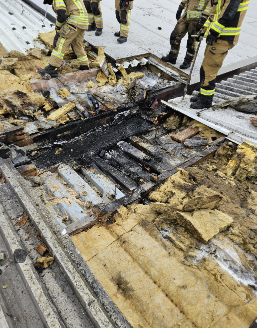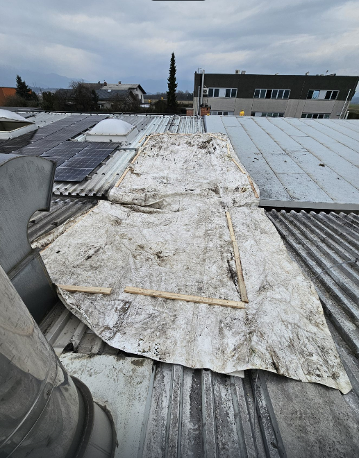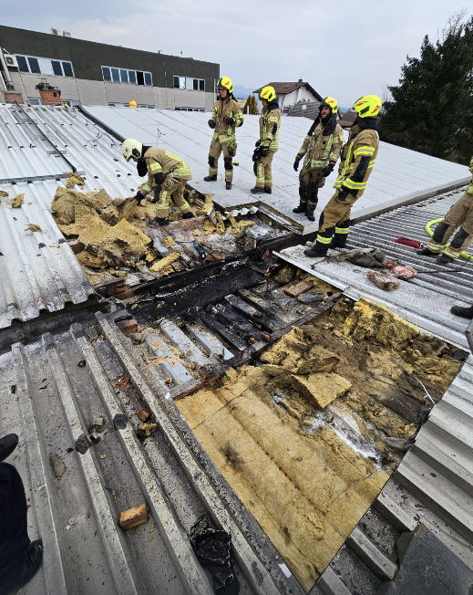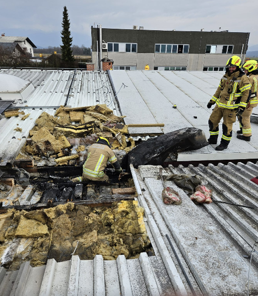 V torek, 24.2.2026 ob 10:47 smo bili preko ReCO Ljubljana obveščeni o požaru v strehi na industrijskem objektu na Gorenjski cesti v Mengšu. Izvozili smo z voziloma GVGP-1 in GVC-1 ter šestimi operativnimi gasilci. Na kraju intervencije smo skupaj z gasilci PGD Mengeš, PGD Topole in PGD Kamnik najprej izvedli evakuacijo zaposlenih in locirali požar v strehi. Pred našim prihodom so zaposleni že z gasilniki omejevali požar iz notranjosti industrijskega objekta. Izvedli smo napad preko trodelne lestve na streho, odprli z žagami pločevinasto streho in požar omejili ter pogasili. Avto lestev nam je bila v veliko pomoč pri transportu gasilcev in težke opreme na streho. Okolico požarišča smo pregledali s termo kamero. Ožgane elemente smo odstranili s strehe, odkrito streho pa prekrili s folijo/cerado. Na kraju sta bila prisotna tudi dežurni elektro in policija.